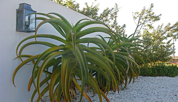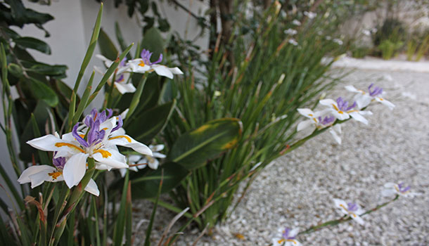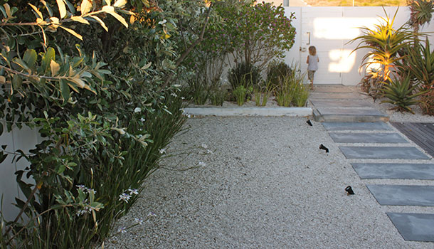 Several aspects of the hard landscaping, such as the stepped pathway and exterior lighting, were designed by the architect.